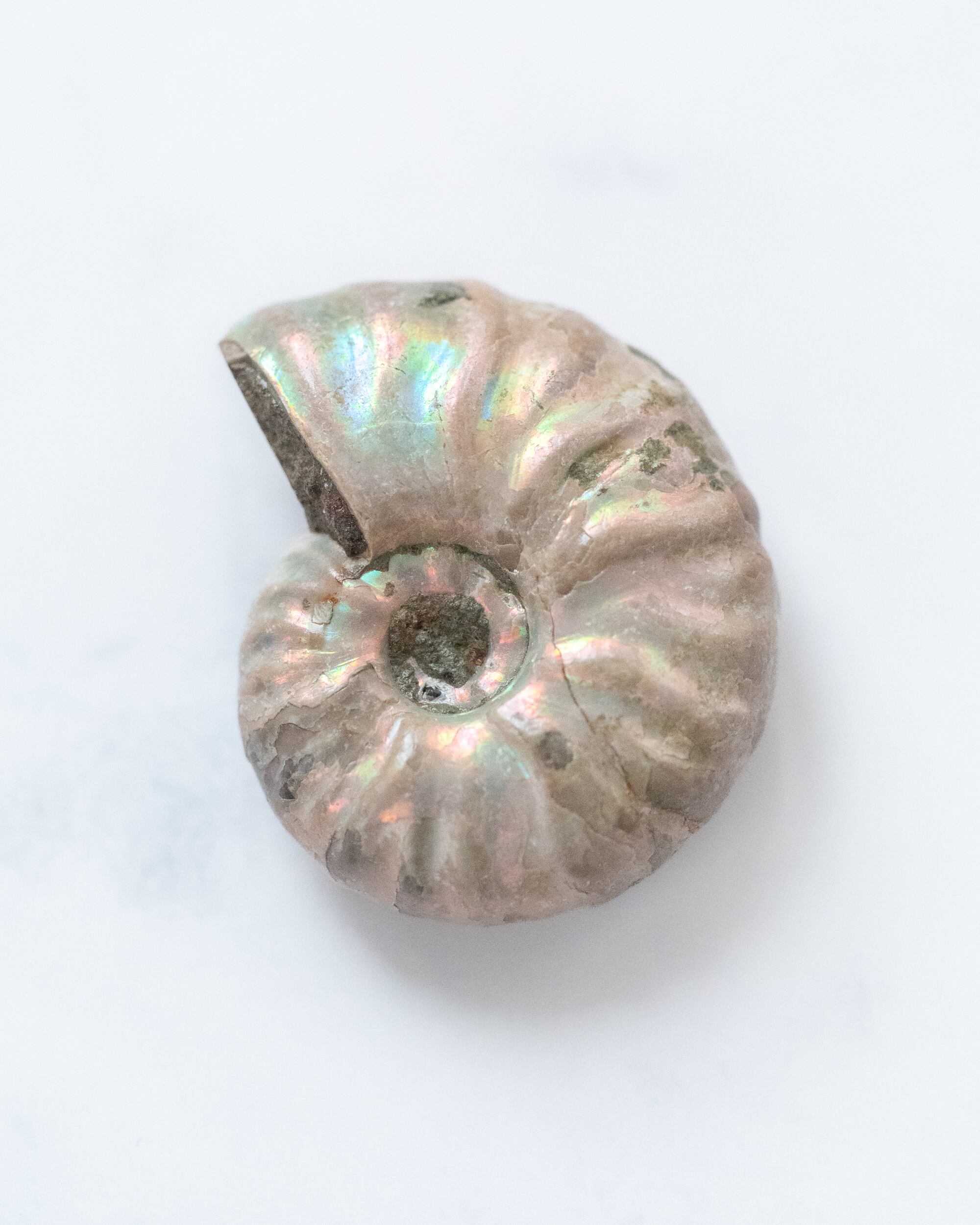 小さな螺旋に虹色の光がそっと宿る マダガスカル産のマハジュンガ・アンモナイト。