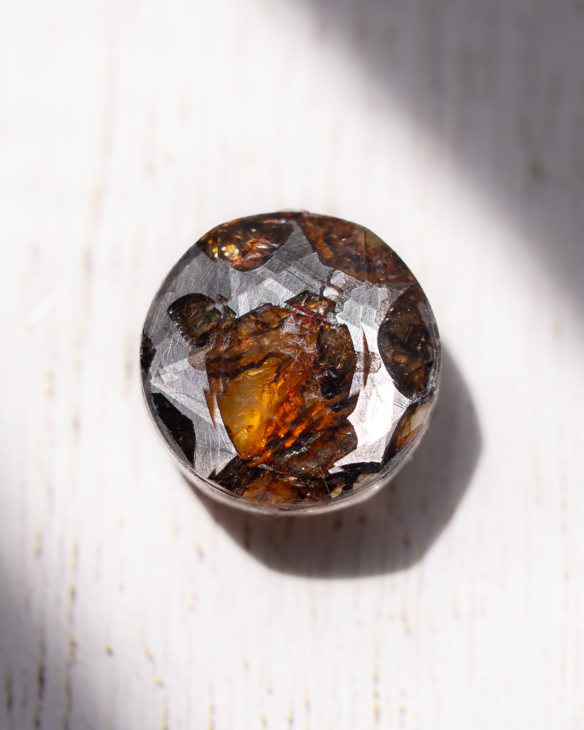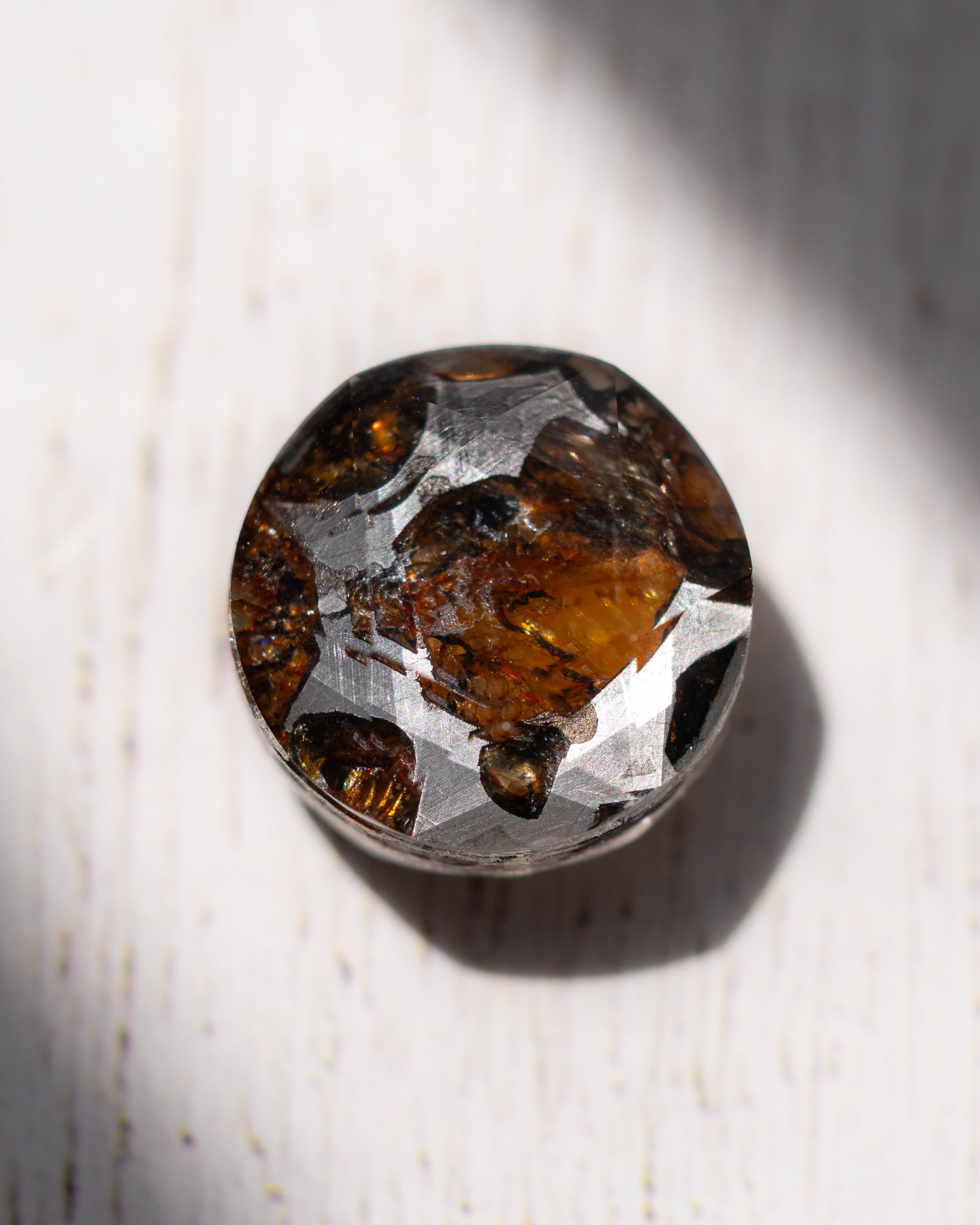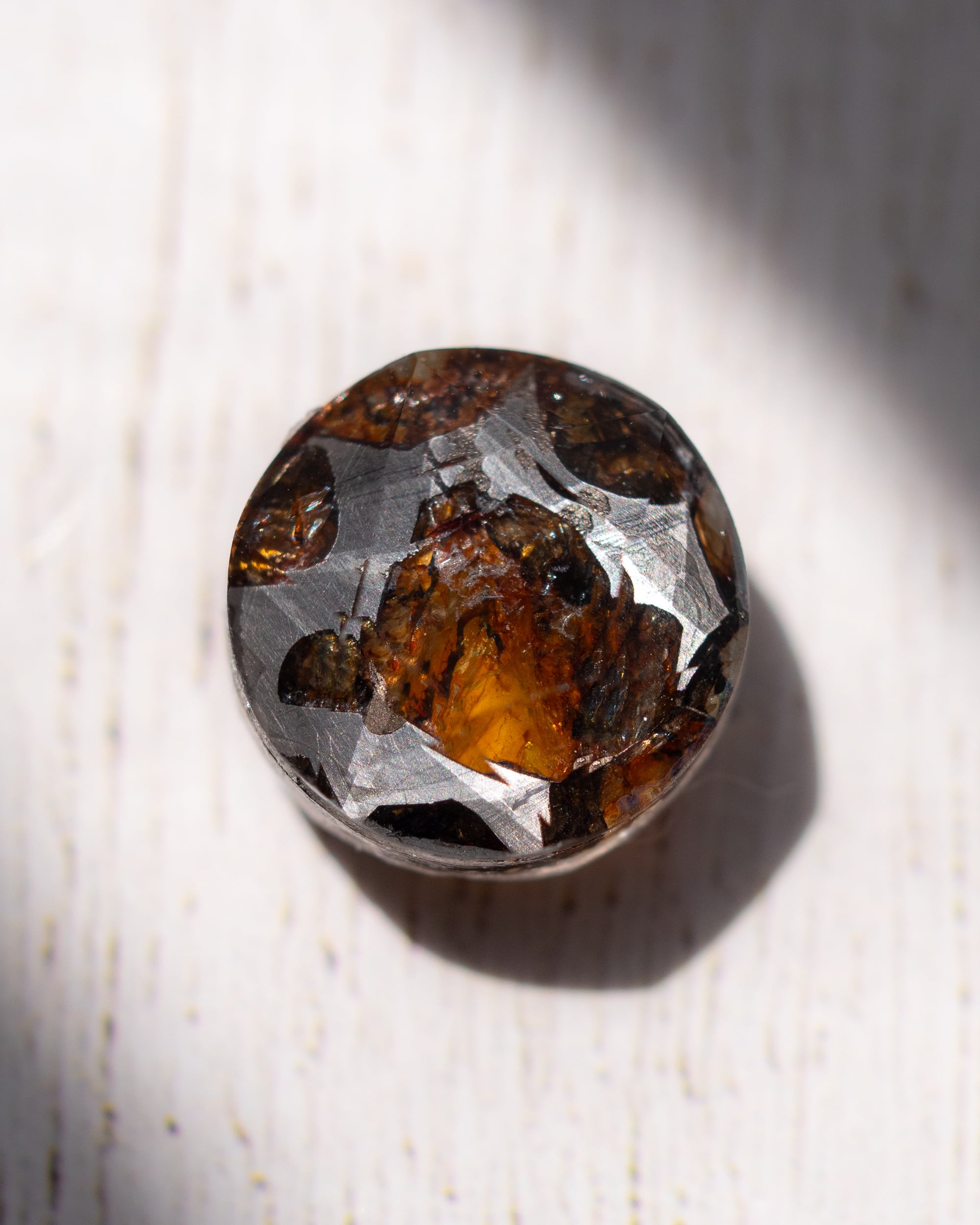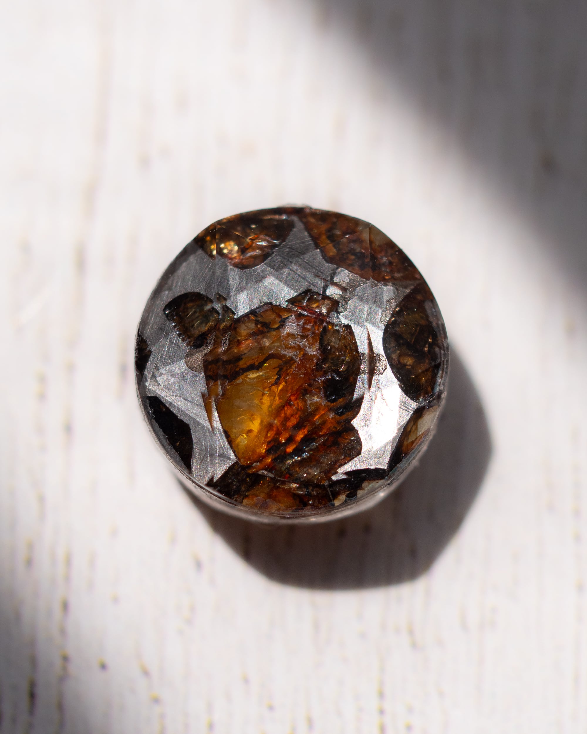 隕石のメタリックな光沢とカンラン石の琥珀色は