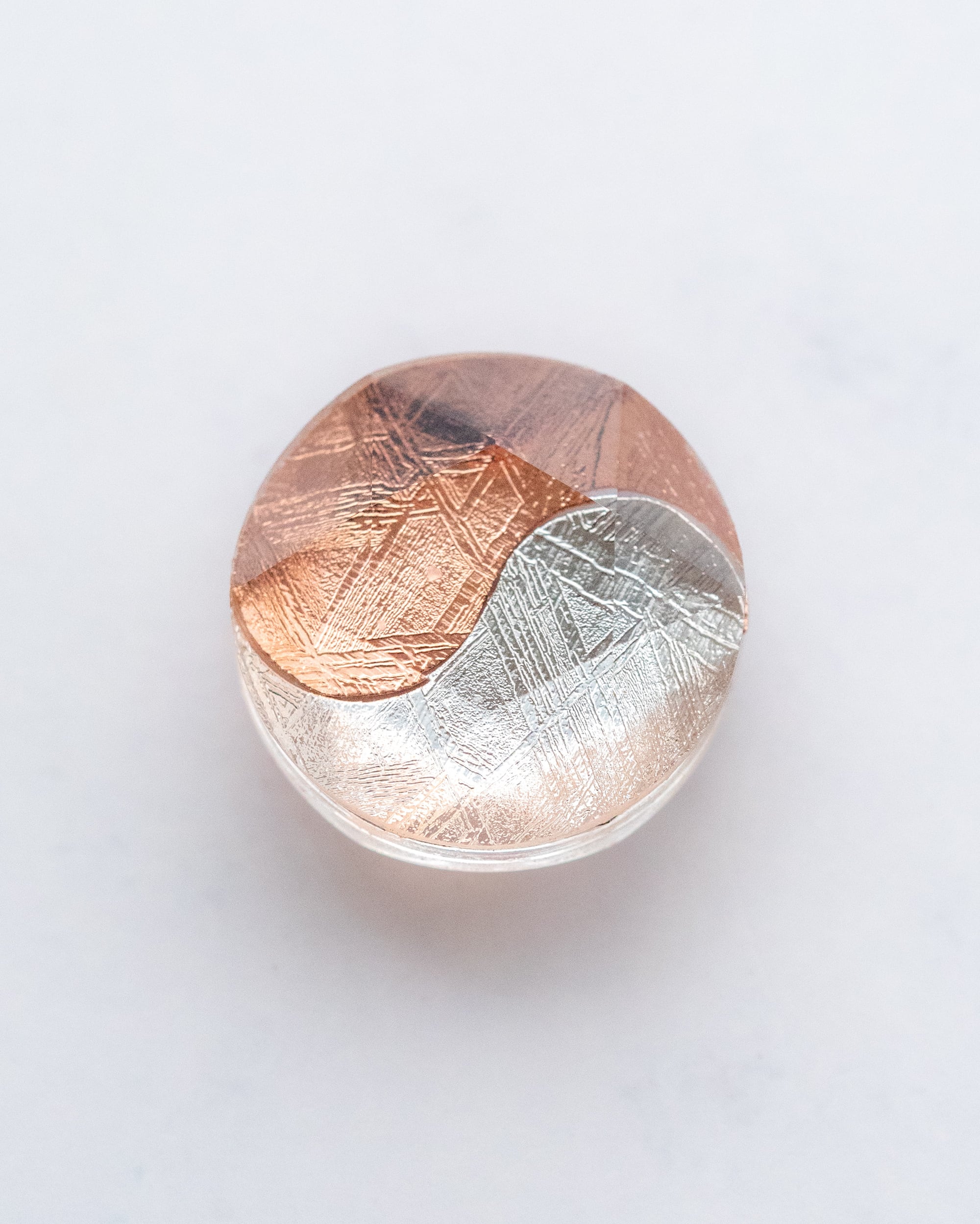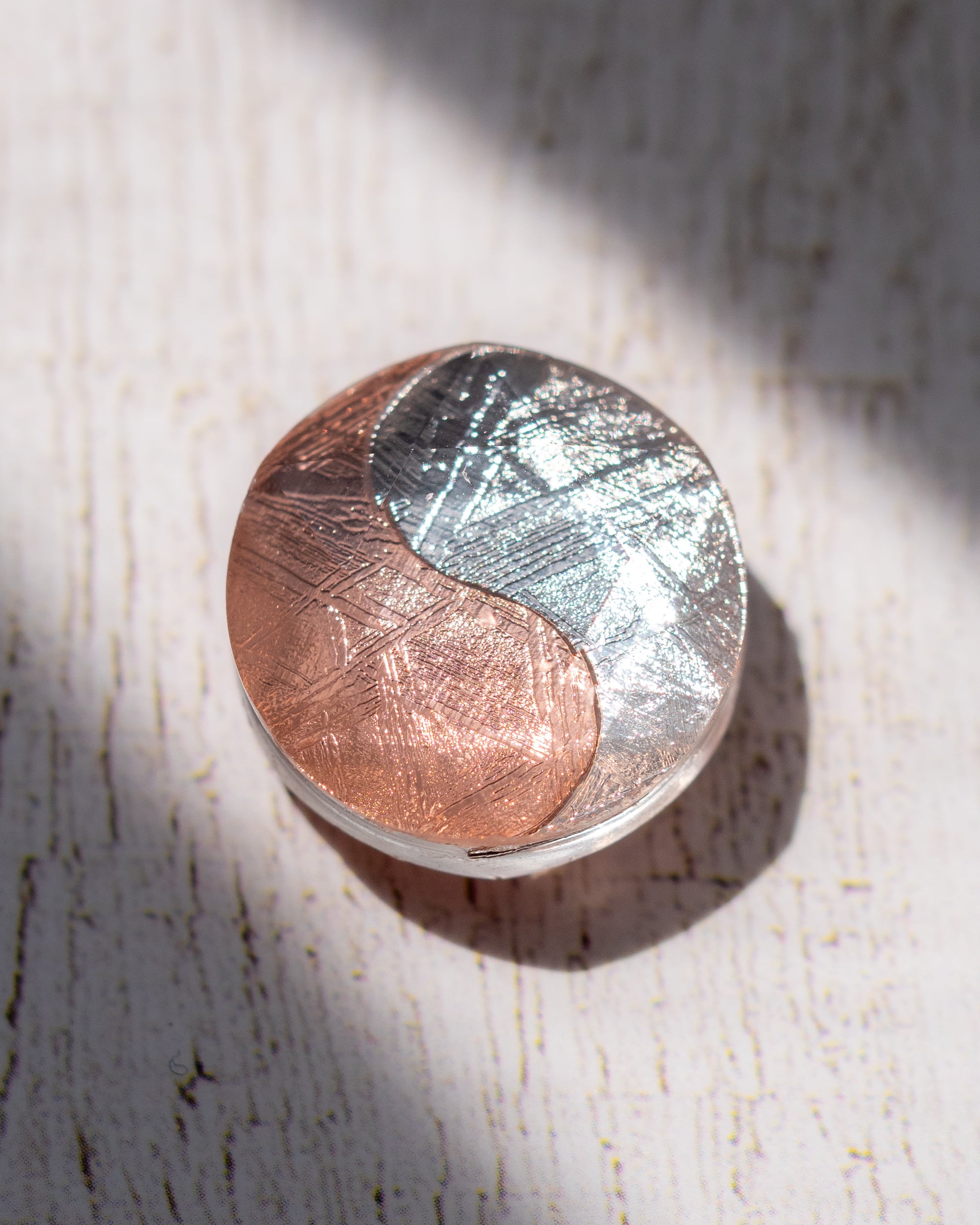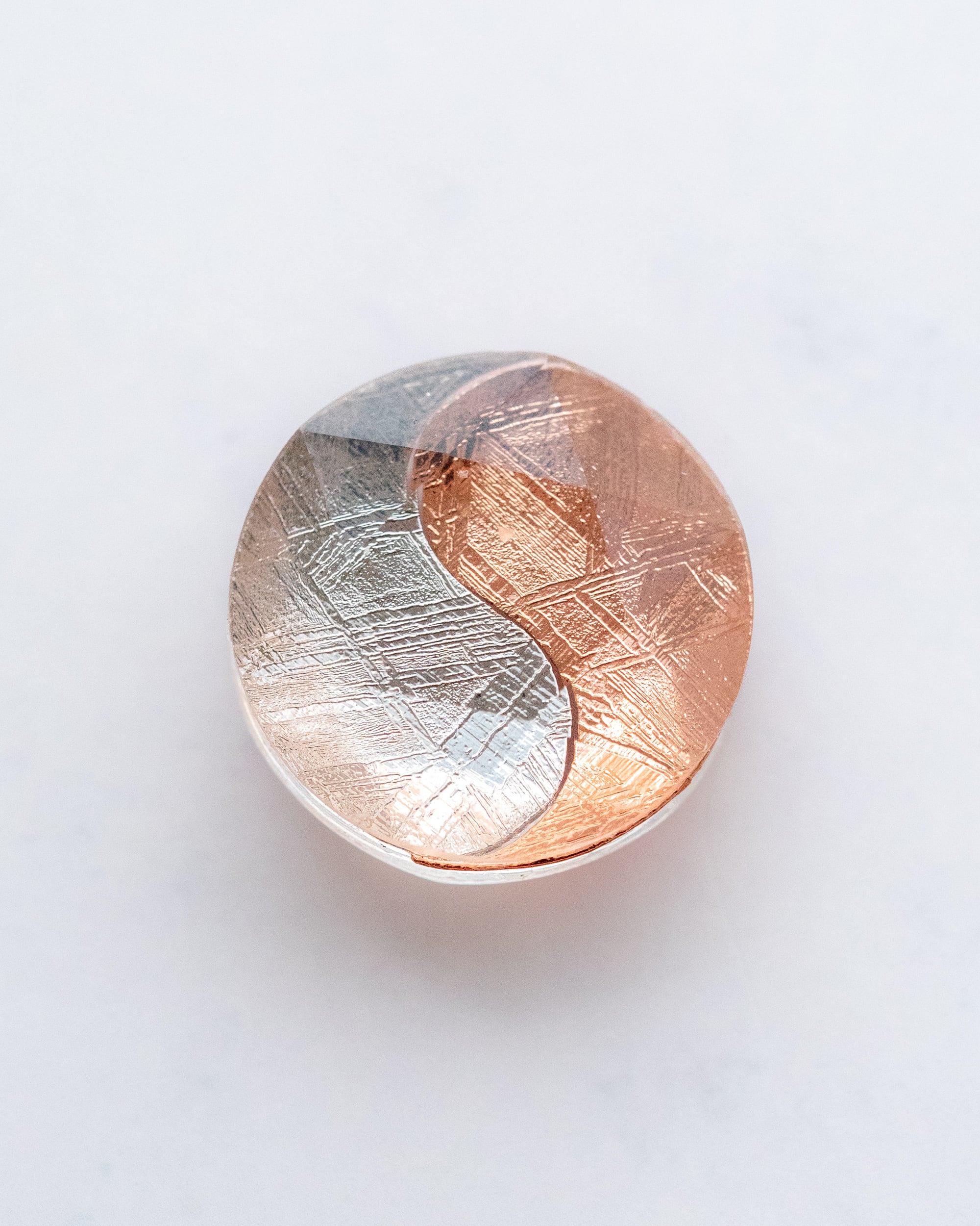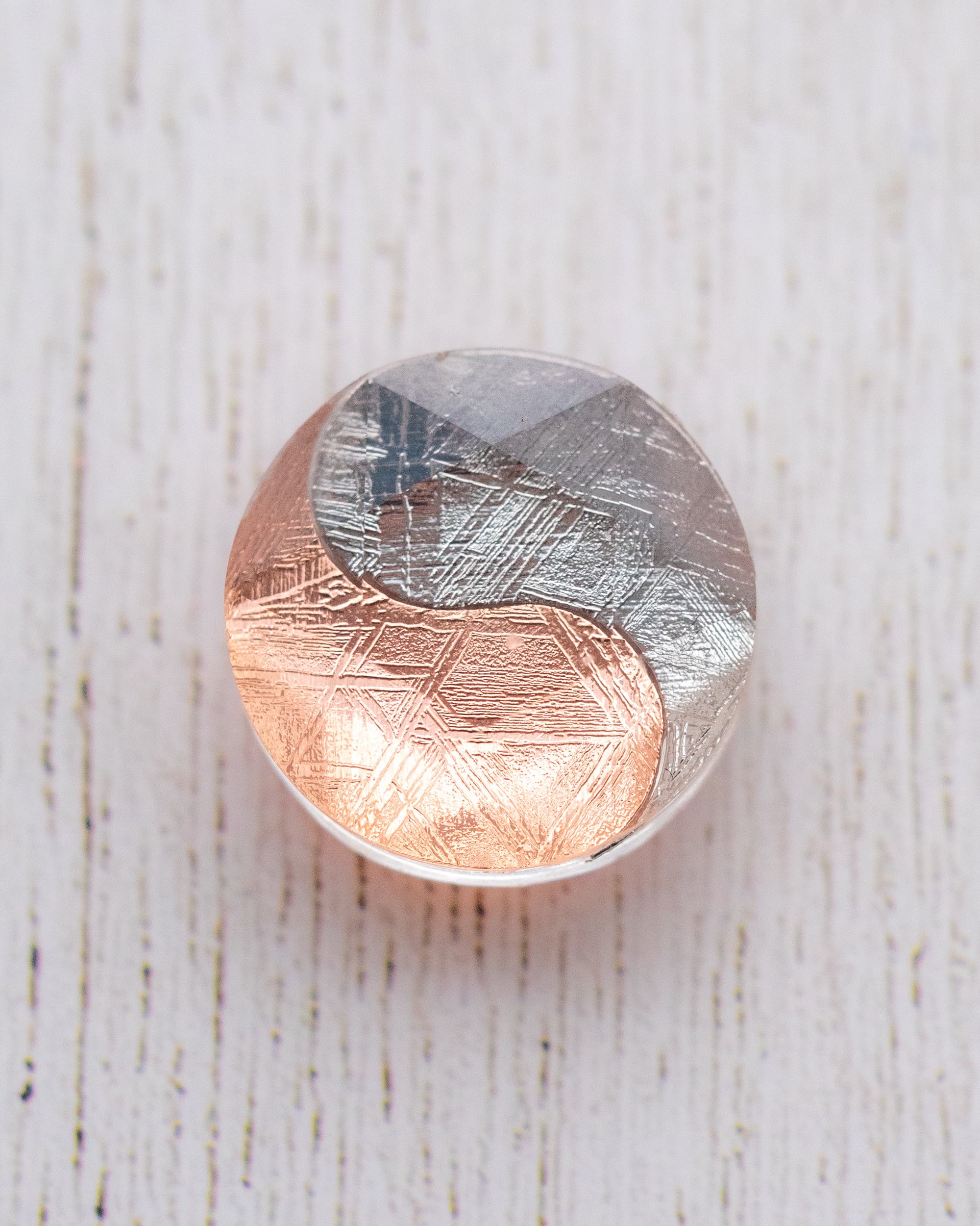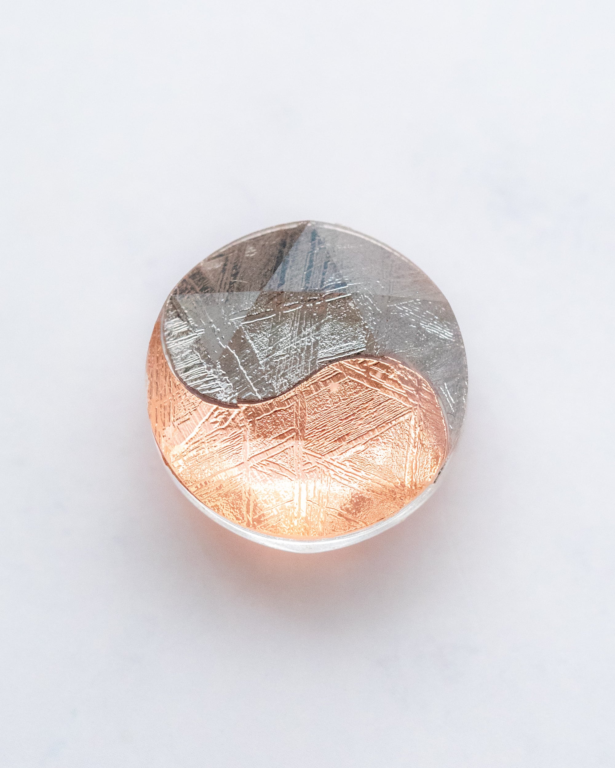 ムオニナルスタ隕石のシルバーとピンクゴールドで描かれた 陰陽太極図のピース。