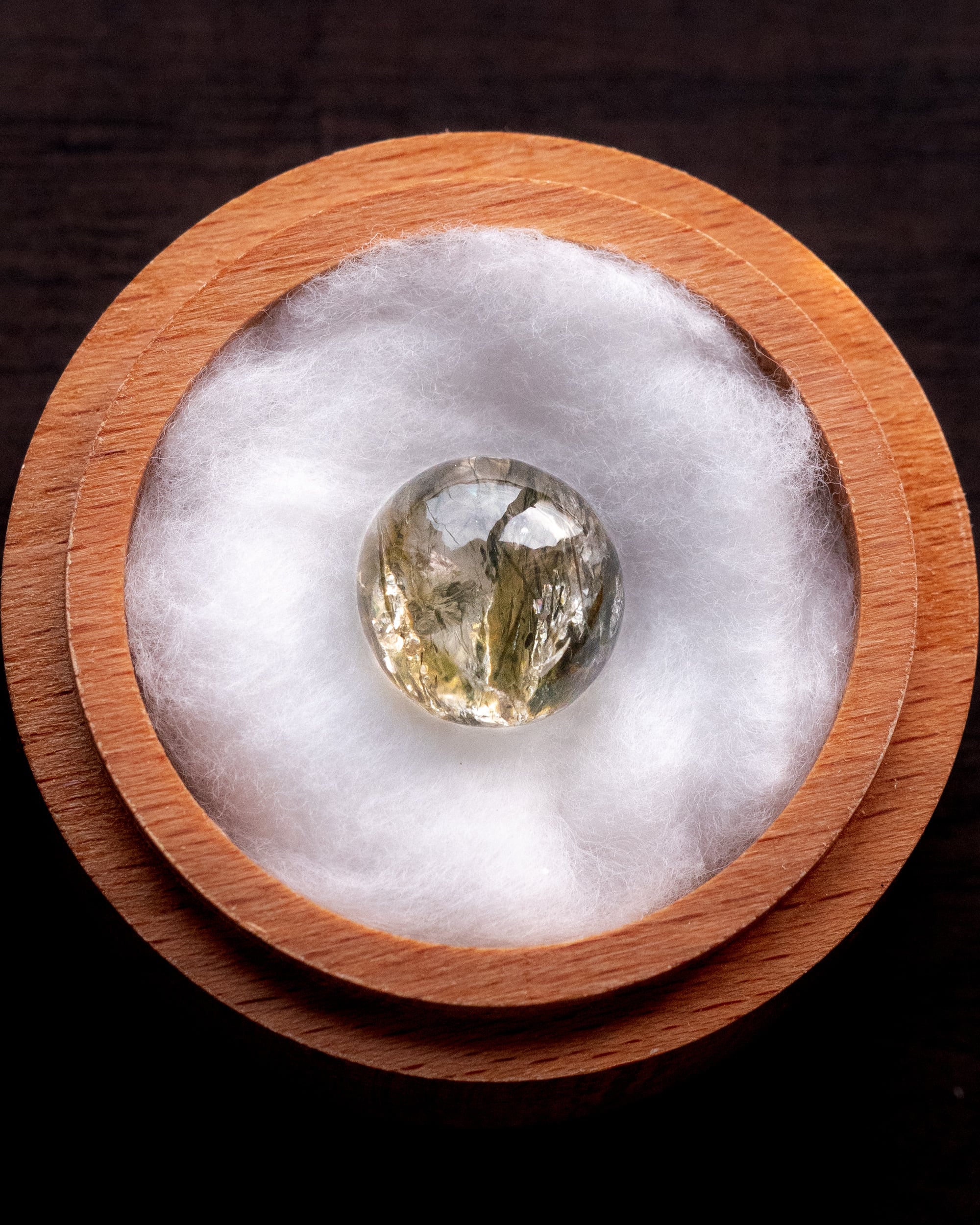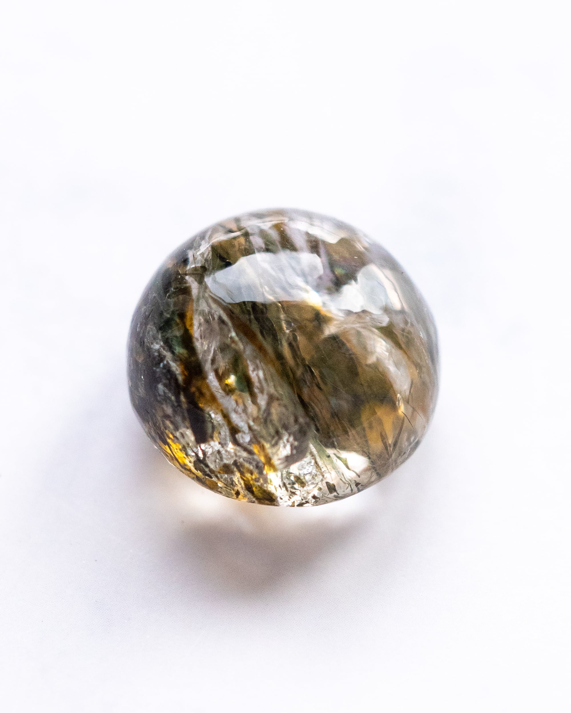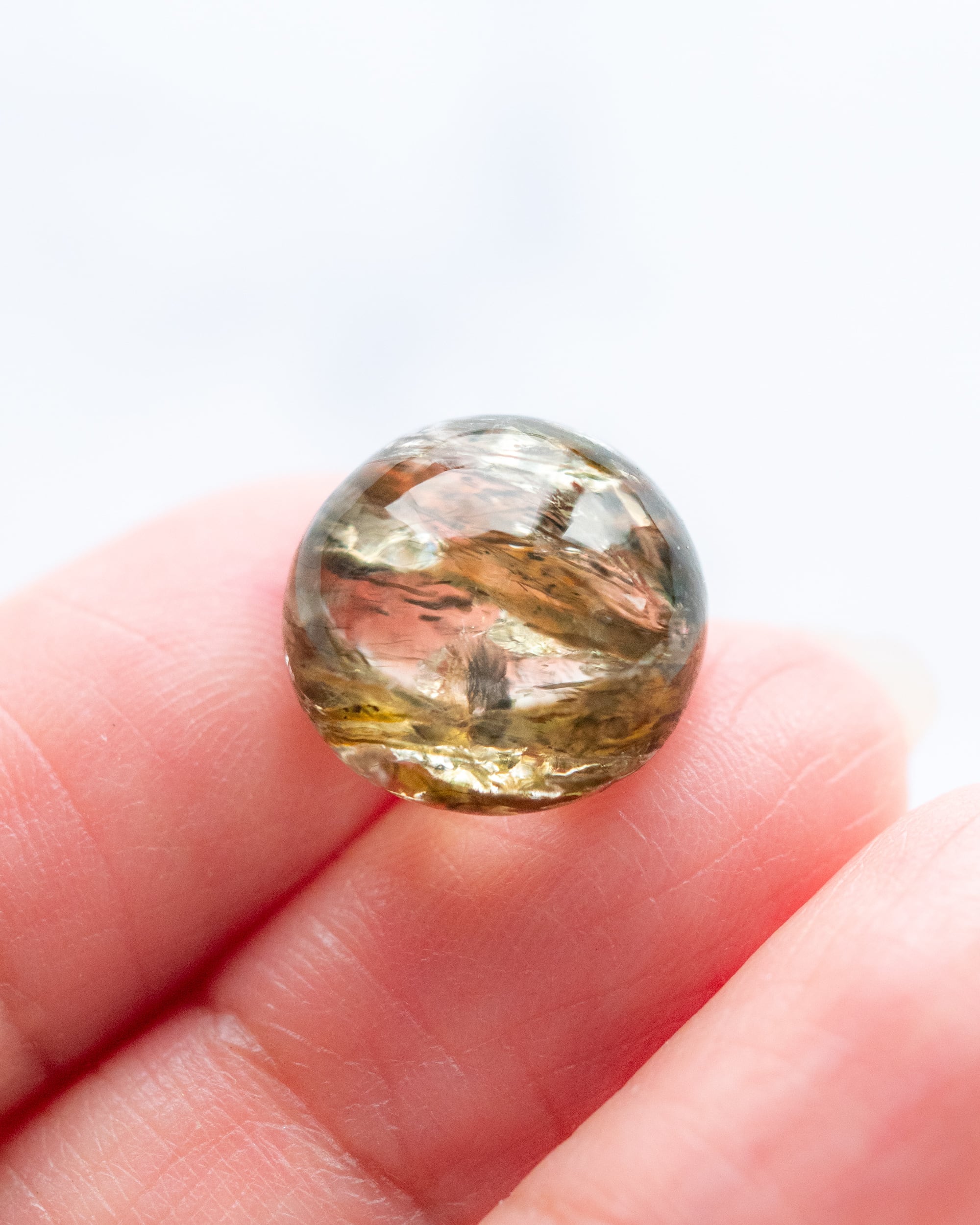 エピドートの濃淡のある色彩や煌めく虹が美しく ぷっくりとした厚みは 石の中がより立体的に見え 眺めているのが楽しい一点。