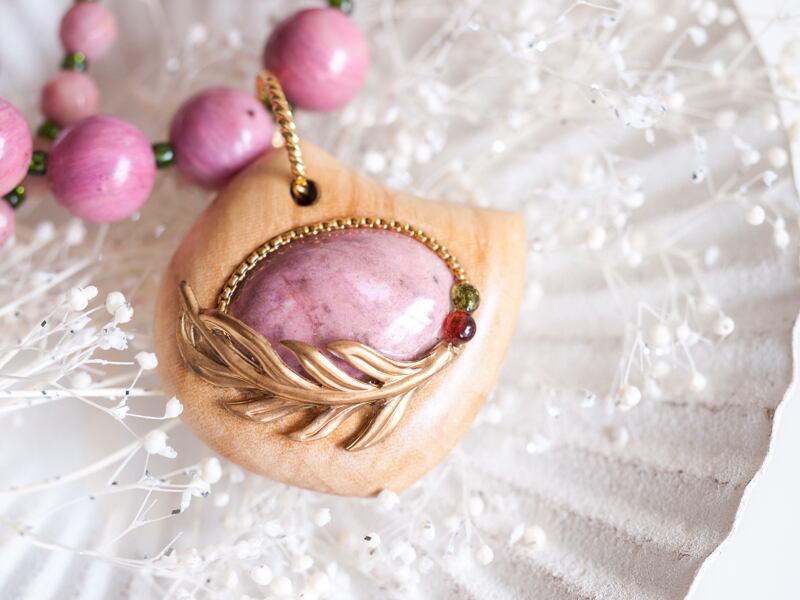 淡いピンク色をした国産のロードナイトを 滑らかな栃の木で包みこんだネックレス。ぷっくりした鳥のフォルムから この物語は生まれました。