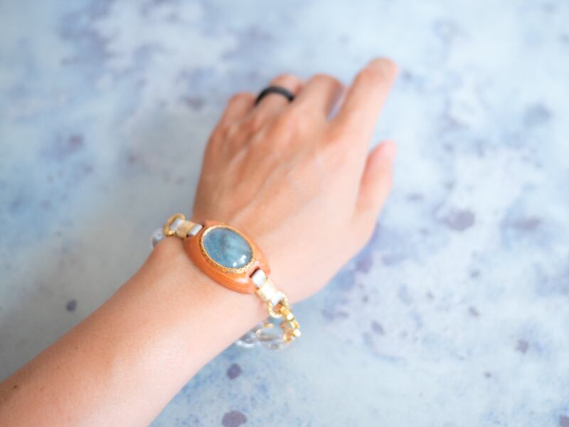 水のように澄みわたる 麗しいアクアマリン。水辺に縁の深い伊吹柏槇という針葉樹の木を用いて 二連のブレスレットへとお仕立て致しました。