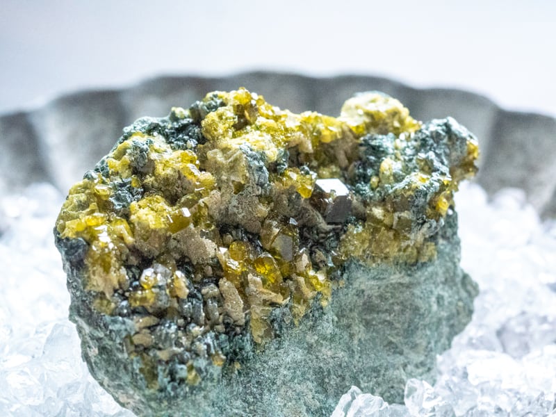 一つの母岩に エピドートを中心とした様々な鉱物が共生する鉱物標本。